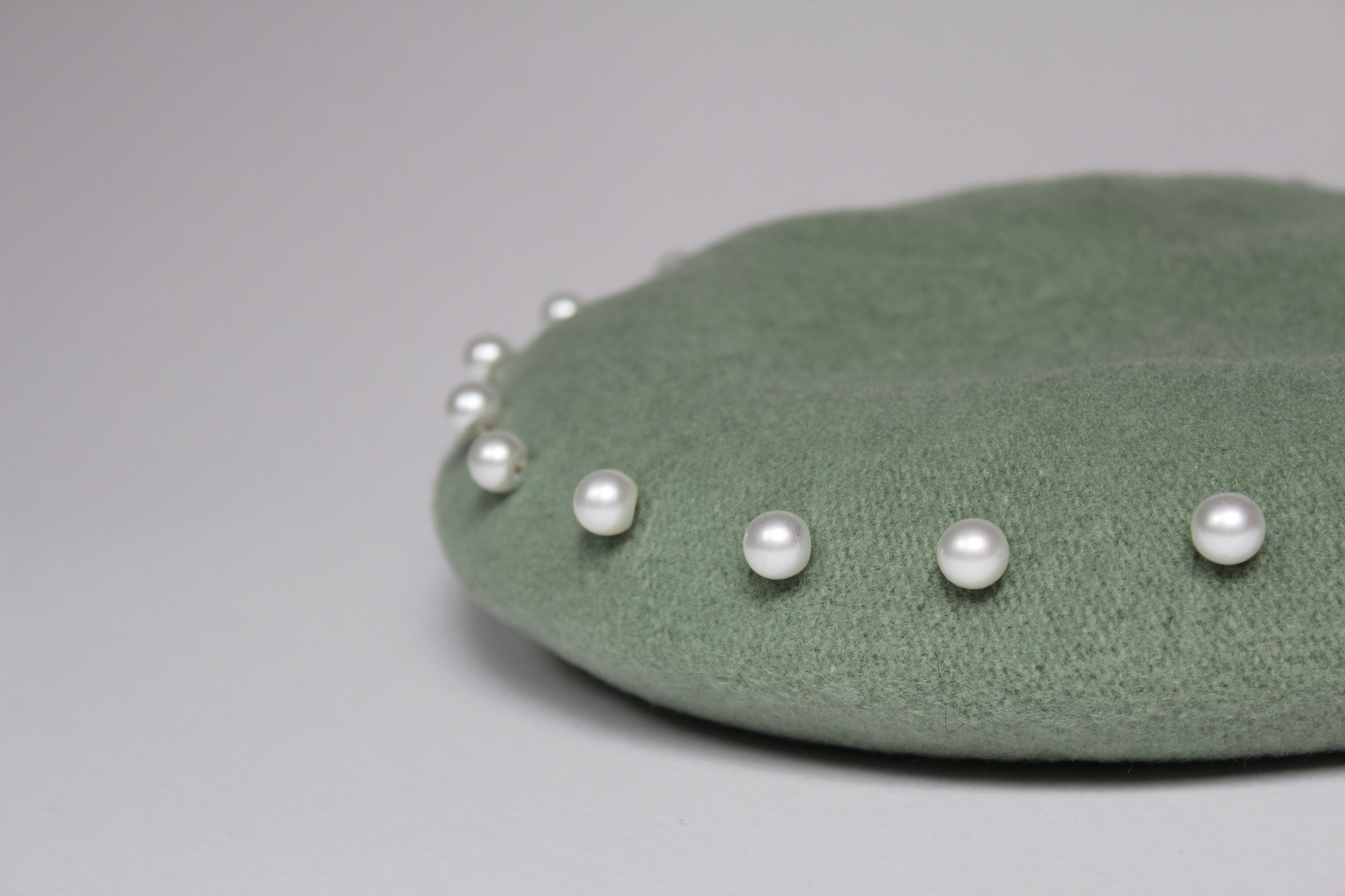 メイドインチェコのウールフェルトのベレーにラウンド型のパールを縫いとめています。